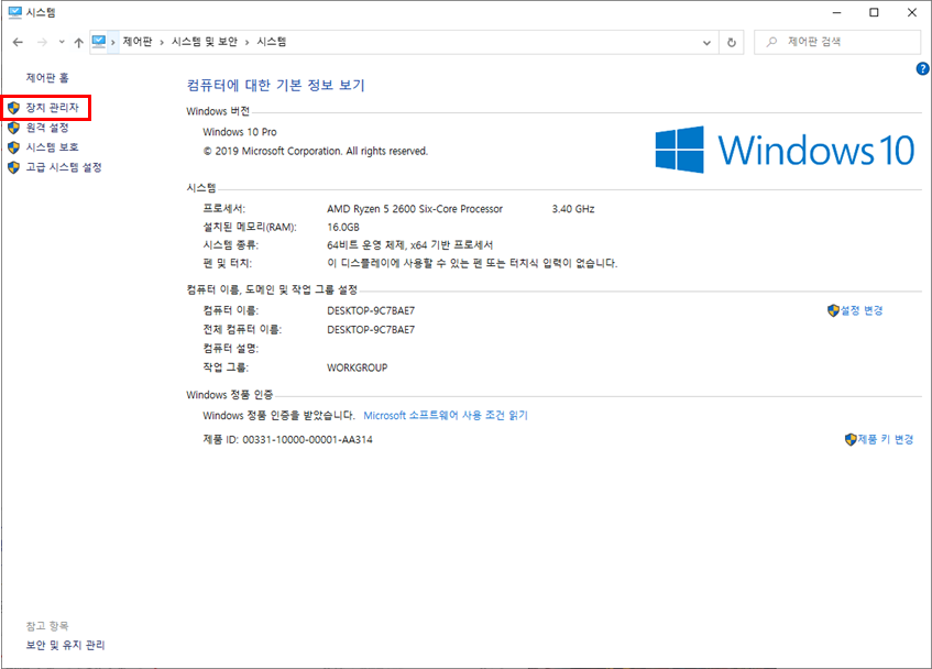 1) '시스템' 창 좌측에 있는 '장치 관리자'를 선택합니다.