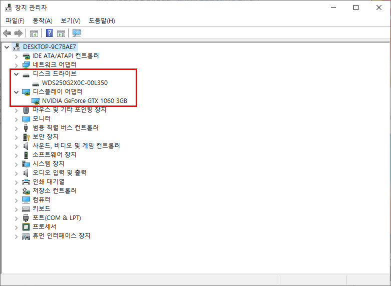2) '디스크 드라이브'와 '디스플레이 어댑터'를 확인하시면 하드디스크와 그래픽카드 종류를 확인하실 수 있습니다.