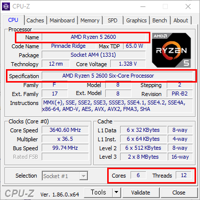 1) CPU-Z 실행 시, 가장 먼저 노출되는 탭에서 내 컴퓨터의 'CPU'를 확인할 수 있습니다.