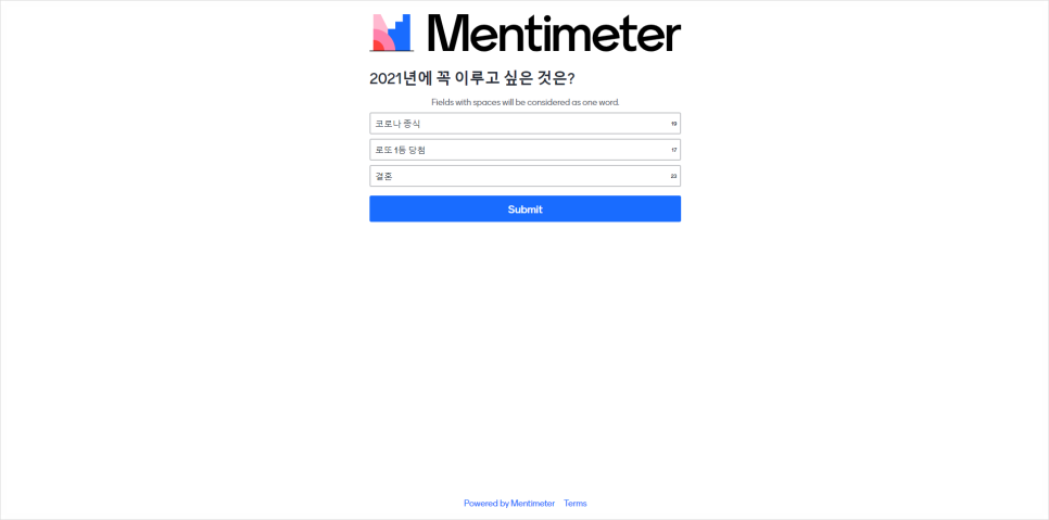 코로나로 인하여 회의나 교육이 힘든 시기인데 각종 화상회의 툴을 사용하면서 Mentimeter를 이용한다면 더 효율적인 강의(학습)를 할 수 있지않을까 조심스레 예상을 해봅니다.