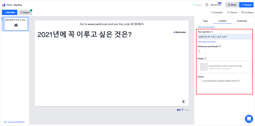 2) Entries per participant : 1인당 최대 답변을 몇개까지 가능한지 설정(default : 3개)