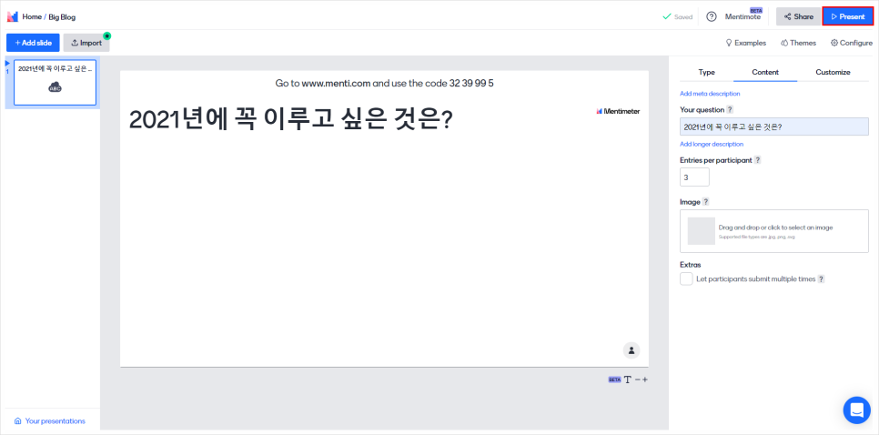 4. 우측상단에 위치한 [Present] 버튼을 통해 설문을 생성완료합니다.